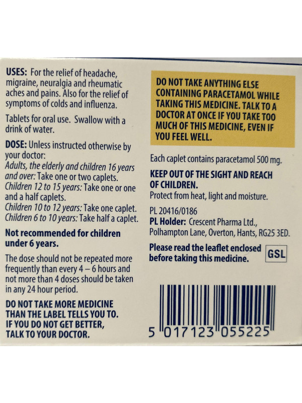 Active Ingredient: Each Tablet/Caplet contains: Paracetamol 500mg.